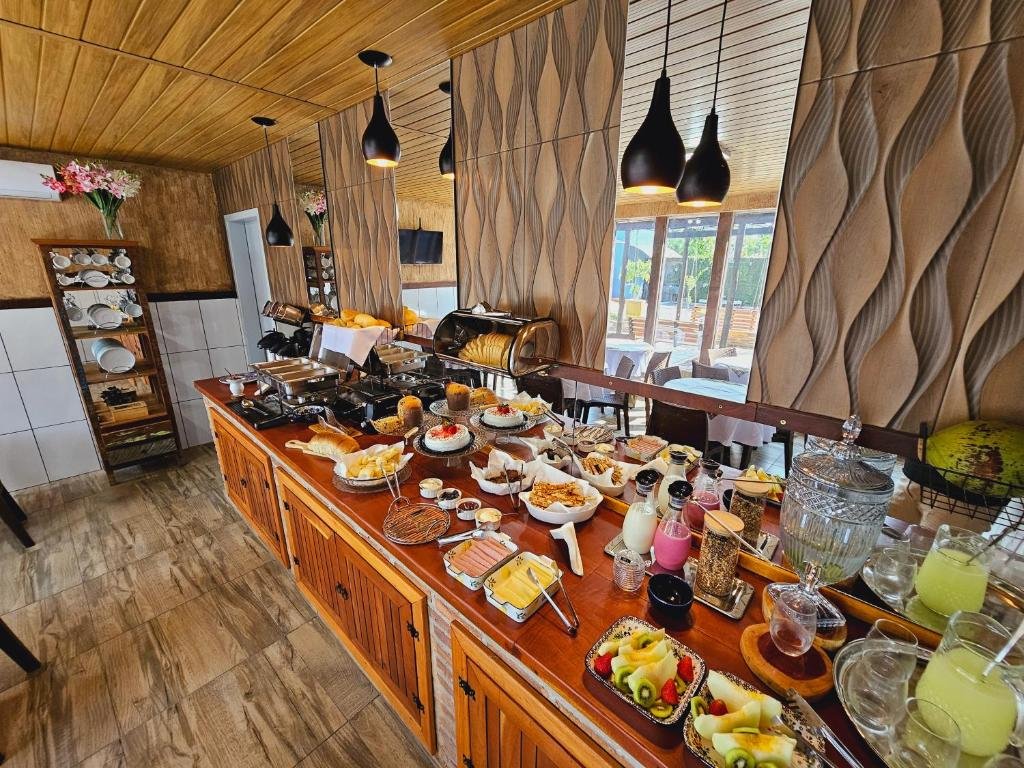 O café da manhã é servido em estilo buffet ou continental, atendendo bem quem sai cedo para os passeios em Bonito, como Gruta do Lago Azul, Aquário Natural, Rio Sucuri e demais atrativos da região.